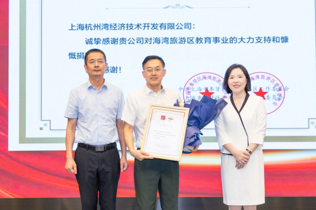 海湾旅游区党工委副书记、管委会主任李瑞忠向上海杭州湾经济技术开发有限公司党委书记、董事长蒋祎青送上捐赠感谢证书, 附属奉贤实验中学副校长包蓓姹(主持工作)代表教师们献花。