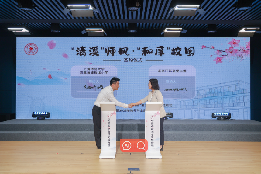黄浦区老西门街道党工委书记姚恒衡和 附属黄浦梅溪小学党支部书记张叶清共同签署了师德师风社区实践计划共建协议。