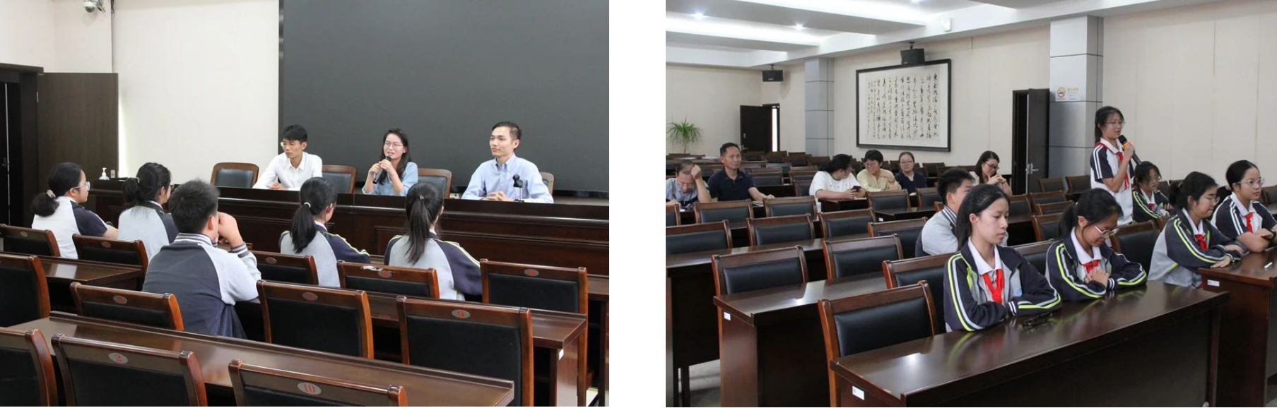 在二楼会议室,建工学院的三位年轻教师陈旭、董翰林、罗晶与部分初三学生进行了交流,三位教师介绍了自己的求学历程,并解答了学生们在学习上遇到的困难,学生在彼此交流分享中进一步明确了努力方向。