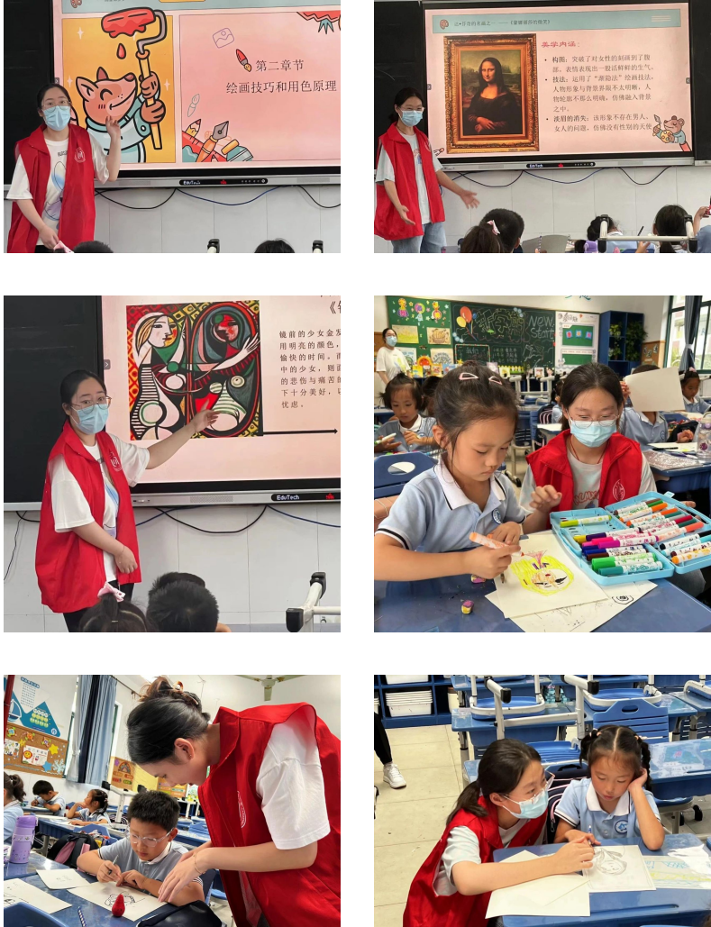课程伊始,志愿者先向同学们介绍了绘画的基本技巧和原理,帮助他们打下扎实的基础。孩子们专注地听讲,认真记录着每一个要点。随后,为了加深对艺术的理解,志愿者还特意带领同学们分析欣赏了《蒙娜丽莎的微笑》这一知名作品。通过对这幅千古名画的深入剖析,孩子们不仅领悟到了艺术的魅力,还对绘画背后的文化内涵有了更深的理解。他们惊叹于画家的技艺,也感受到了艺术所传达的情感和思想。