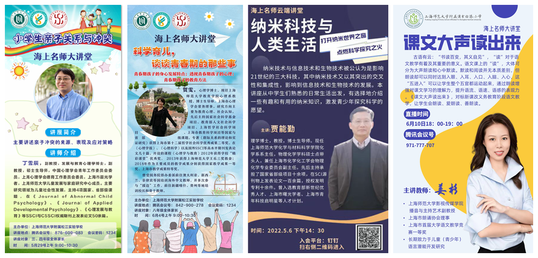 作为我校服务集团附属学校的品牌项目,这一季的“海上名师大讲堂”由于疫情搬上了“云端”,两个多月以来共举办了30余场专题讲座,从小学到高中,这季线上讲座受众范围广,惠及上万名附校学子,众多老师、家长也从中受益。为了保证首次“线上季”活动的顺利进行, 做了大量的准备,充分调研,提前调试,在时间、平台、方式上尽量满足各个学校的个性化需求。而在讲座内容方面,每场讲座的主讲教授都精心准备:在讲座策划的方向选择上,结合“双减”背景下,从文学、艺术,到科技、航天等,涉及方方面面;在具体讲授内容设计上,也颇花心思,为中小学生度身定制适合其年龄层次的方式,生动有趣、深入浅出。30余场“云端”系列讲座,场场精彩,亮点频现。