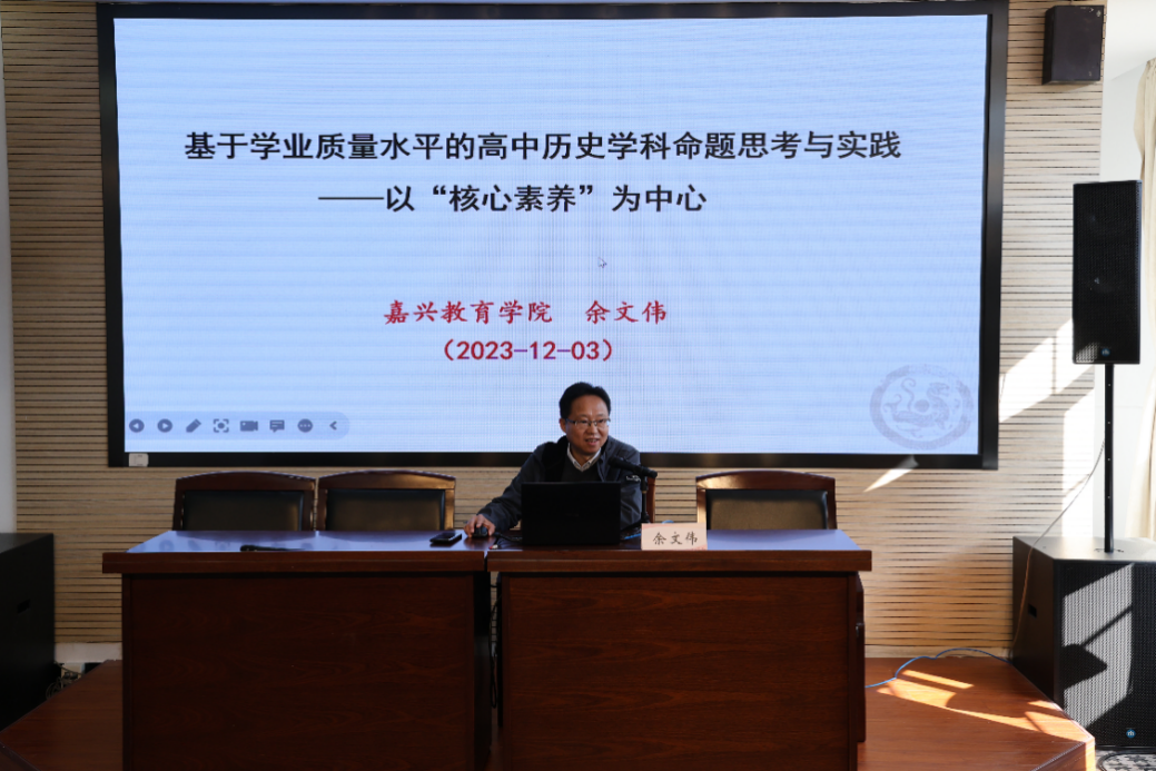 嘉兴市历史教研员、特级教师余文伟作了《基于学业质量水平的高中历史学科命题思考与实践——以“核心素养”为中心》的报告,他从“思考:命题视域下的核心素养与学业质量”“实践:素养视域下的试题分析与团队建设”两个层面,就素养导向的试题研究,及提升教师命题能力的研究过程及实践成果作了分享。