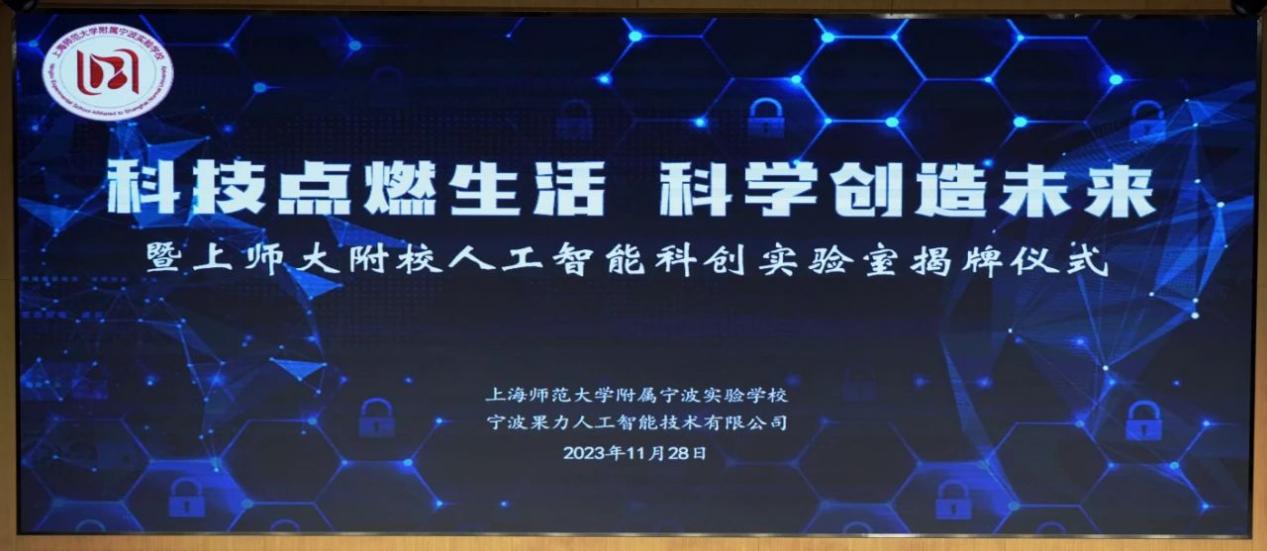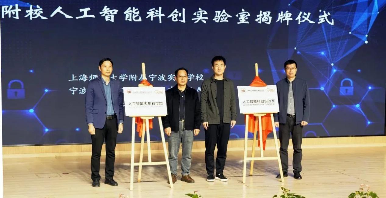 2023年11月28日上午, 附属宁波实验学校举行了主题为“科技点燃生活 科学创造未来”的人工智能科创实验室揭牌仪式。宁波市教育局装备中心主任俞奇峰、方桥街道党工委书记毛海涛、奉化团区委书记张钦皓、奉化区科协主席王亦建、奉化区教育局领导李永强、方桥街道副主任周黎、奉化科协秘书长徐亚莲、宁波生命科学城金茂副总经理丁晶、方桥街道教办主任董建平等参加揭牌仪式。揭牌仪式由附属宁波实验学校校长胡培华主持。