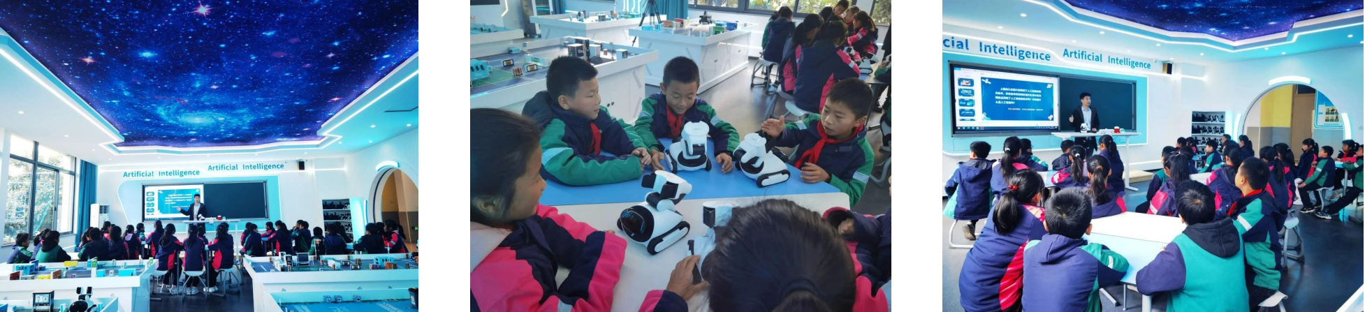 揭牌仪式后,参加活动的领导、来宾参观了学校科创实验楼,并观摩了人工智能第一课。果力人工智能讲师杨定坤用“互动+漫画展示”的方式为孩子们带来了一堂别开生面的人工智能课,孩子们近距离和人工智能机器人“果小聪”互动,“果小聪”听到孩子们的指令后做出各种动作,同学们纷纷表示非常神奇。