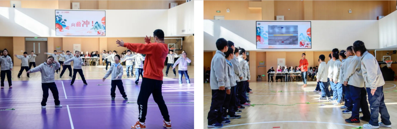 季老师以“小龙人过传统节日”为情境线索贯穿整节课。通过复习、新授、挑战赛等使学生体验不同方式的两人一绳换位跳,步步深入,层层推进,激发学生学练兴趣,提高学生花样跳短绳能力。在练习中,有教师带领的集体练习、双人小组自主练习,更有大队伍的综合游戏体验,教师引导,先学后练,互动互比互评,让学生在练习中互动起来,让每一个孩子都积极地参与到课堂练习中,做到身体、思维都动起来。在综合活动中,季老师巧用击鼓声激励学生,调动学生的积极情绪,促进学习效率。