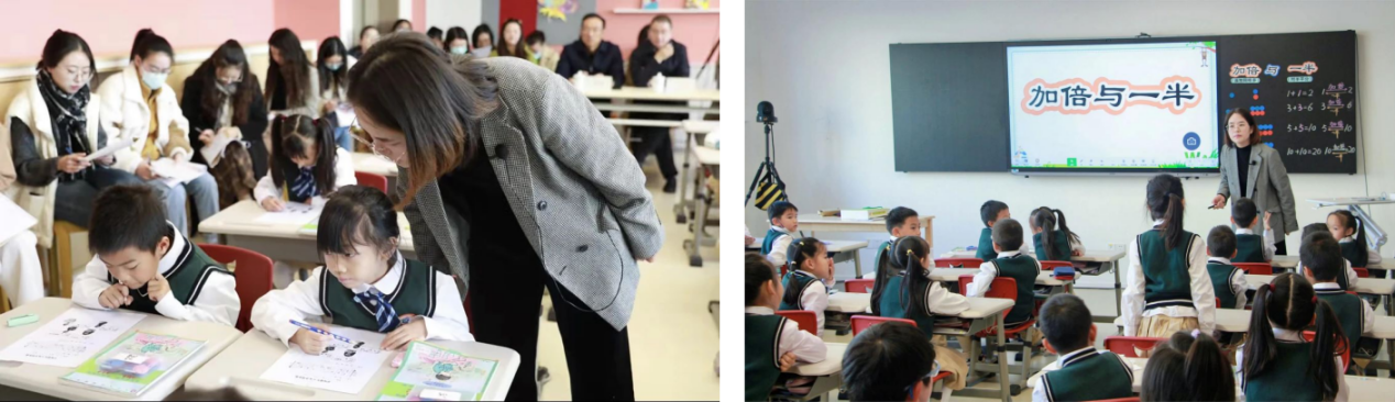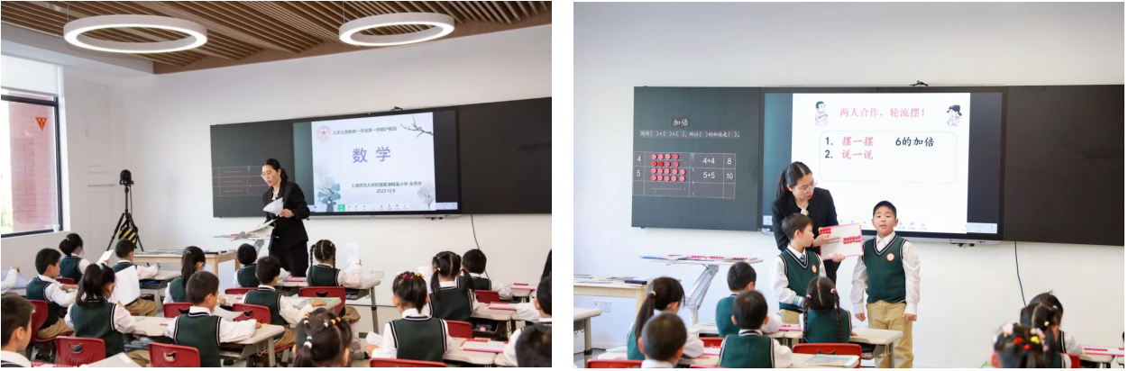 在数学会场,附属金山龙航小学沈君丹老师与附属黄浦梅溪小学朱燕华老师分别执教一年级数学《加倍与一半》。