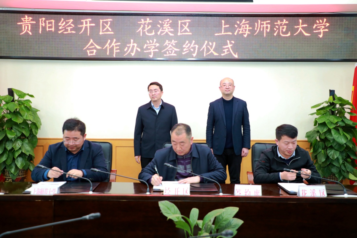 随后, 基础教育发展中心副主任(主持工作)王健、经开区党工委副主任谢秩刚和花溪区副区长周印共同签署了三方合作办学协议。