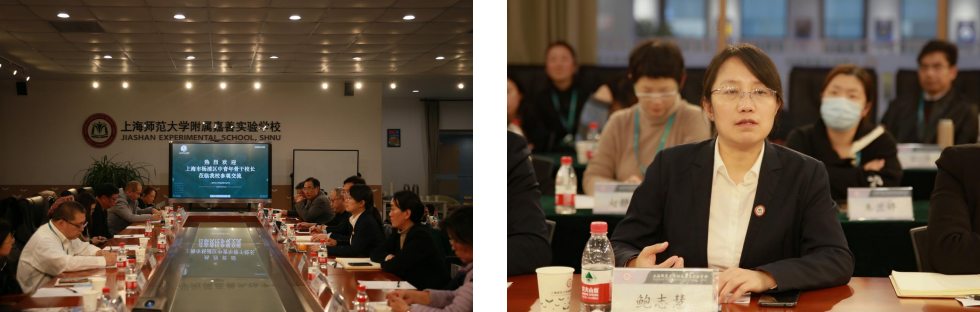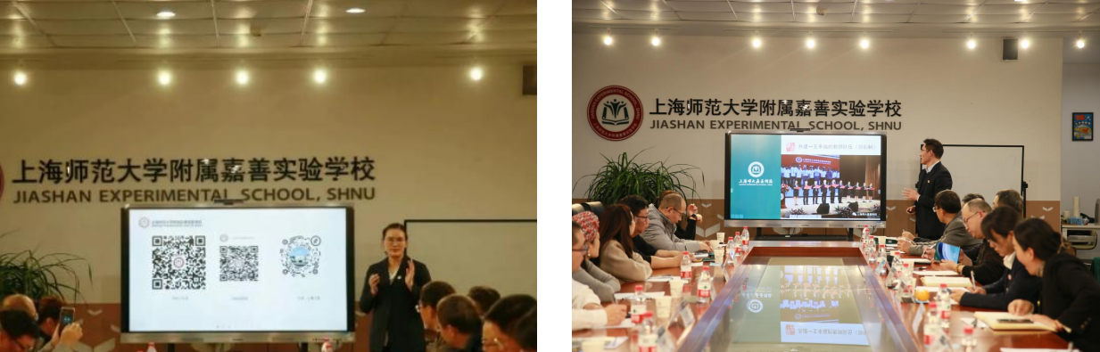 参观结束后,学员与上师大嘉善附校领导班子、相关模块负责人进行了交流座谈。鲍志慧首先向上师大基础教育发展研究院、杨浦区教育学院的领导和学员们表示了欢迎,就学校的基本情况、办学特色和办学成果等方面进行了简要介绍,并与学员们进行了办学经验交流。