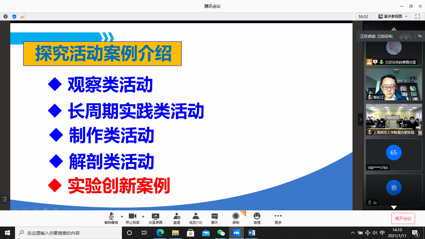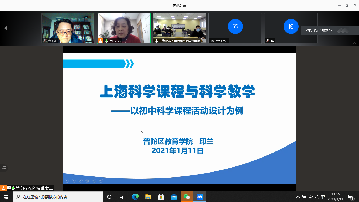 1月11日下午,活动首场报告举行,附属合肥实验学校全体科学教师参与。主讲教师,普陀区教育学院资深初中科学教研员印兰老师,擅长实验教学研究,多次与上海市教育装备技术中心合作,开发与实施科学教师实验能力培训课程。20多年深耕科学教学研究,培养指导的科学教师多次在全国、市级的教学评比中获得一等奖。印兰老师就“上海科学课程与科学教学——以初中科学课程活动设计为例”这一主题,从上海科学课程与教材简介、以核心素养为指向的探究活动两个方面,分享了上海20多年来在综合科学课程建设上的经验。尤其是五个案例:观察类活动、长周期实践类活动、制作类活动、解剖类活动、实验创新类活动,融入了照片、视频、学习单、教学反思等内容,既有理论高度,又有实践的可操作性,分析详实、指导到位,体现了很高的专业水准,科学老师们受益匪浅。