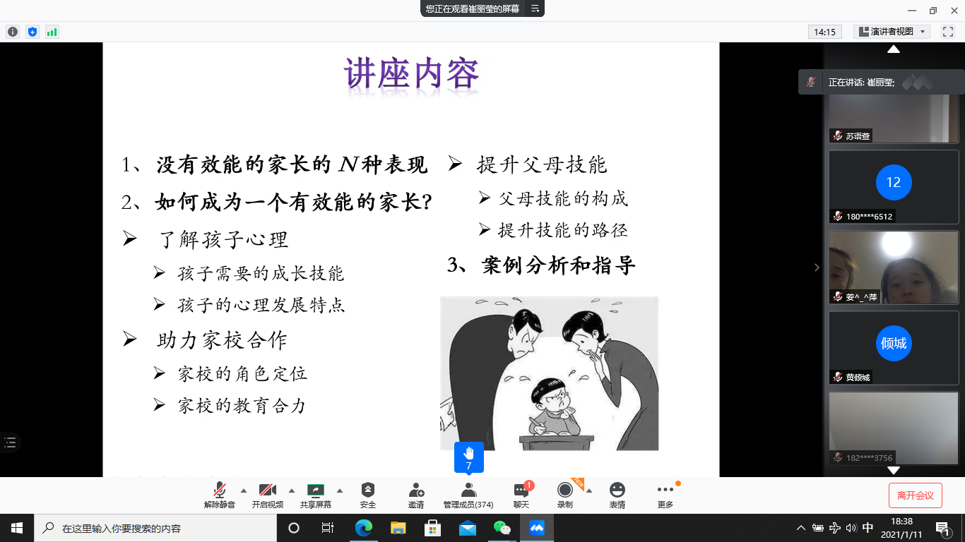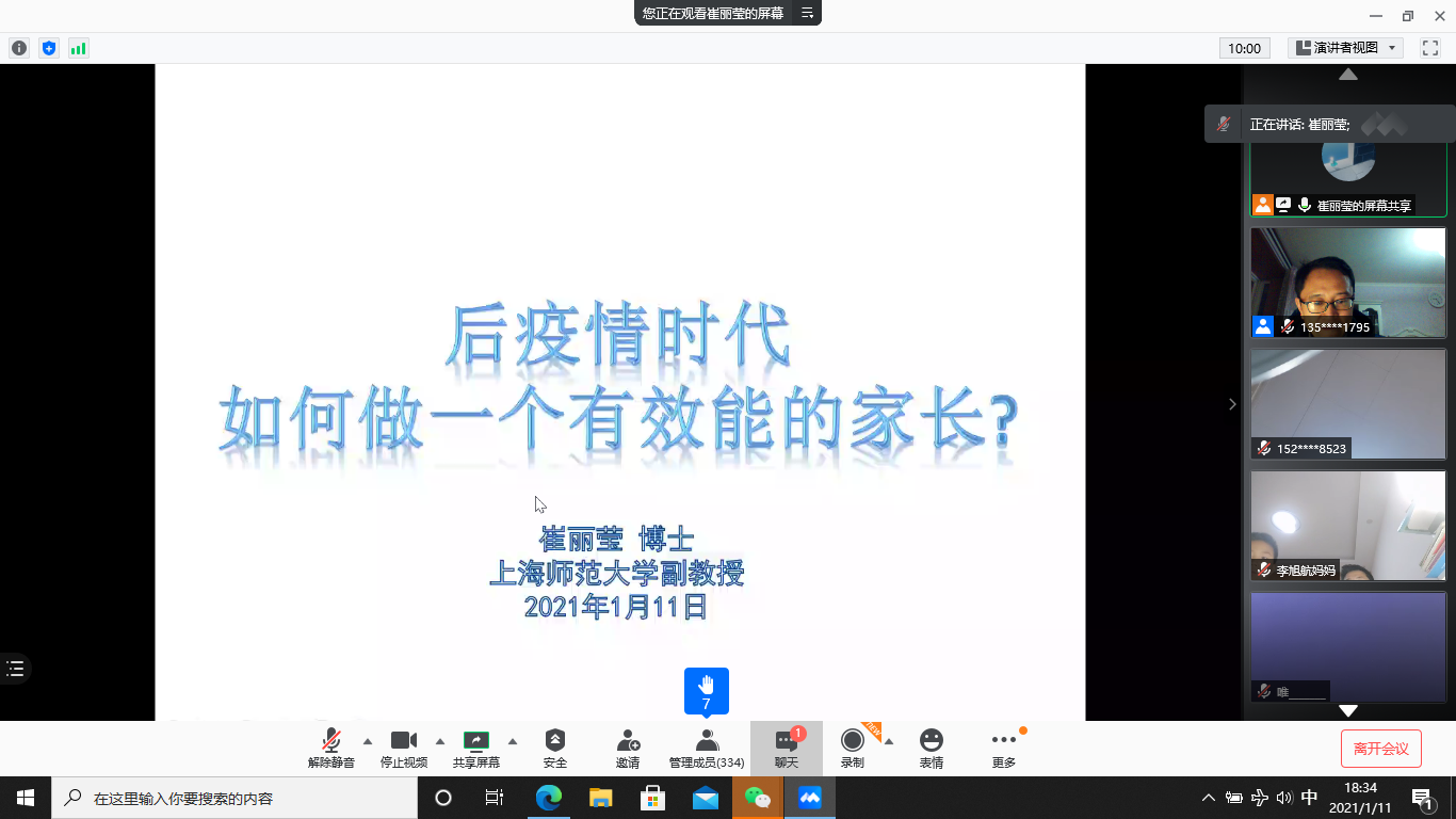 1月11日晚上,活动第二场报告举行,附属合肥实验学校全体家长近500人参与。主讲教师崔丽莹博士, 心理学系副教授、硕士生导师, 发展与家庭研究中心核心成员,中国心理学会会员,上海市心理学会理事,德育心理学专委会副主任,国际行为发展研究协会(ISSBD)会员。研究方向为儿童社会性发展,研究领域为儿童青少年的道德情绪与合作行为。崔教授就“后疫情时代如何做一个有效能的家长?”这一主题,从没有效能的家长的N种表现、如何成为一个有效能的家长、案例分析和指导三个方面,对家长进行了一次生动的、既有理论分析又有具体方法指导的辅导报告。崔教授提到的高效能父母的5种能力:提醒(引导孩子成长)、信任(走进孩子心灵)、宽容(允许孩子犯错)、尊重(放手、放权、沟通、请教)、激励(培养孩子自信坚韧),从孩子心理的角度提出的需要有亲近感、心理自主、有效监督的父母,以及一些具体的、可操作性前的技能等,都给与家长育儿重要的启发和指导。家长们情不自禁留言:说的很好,并在讲座结束后踊跃提问,气氛热烈。