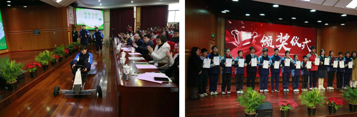 在零碳飞驰活动中, 附属前京中学的前京5队同学们根据他们比赛中做零碳小车的体会作成果汇报, 第二附属中学的攀峰队更是把自制的小车带到了现场为大家进行演示。同学们纷纷探头凝神,现场氛围热烈。金山区青少年活动中心沈丹萍主任、 附属金山前京中学校长宋红霞为获奖队伍代表颁奖。