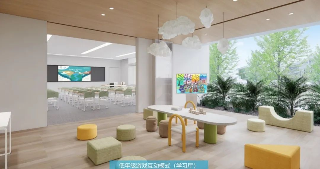 最为特别的是教室的设计——“两室一厅”,两间教室分在两侧,中间由一个讨论厅连接,可移动的隔断,让空间自由变换,或独立或共享。