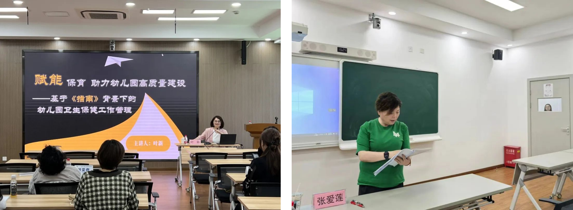 在“园长如何引导保育、托育教育”沙龙研讨中,嘉定区托育服务指导中心主任叶新和紫薇实验幼儿园园长张爱莲对学员进行了分组专题指导。叶新主任以“赋能保育,助力幼儿园高质量建设——基于《指南》背景下的幼儿园卫生保健工作管理”为主题,深入剖析了保健管理、健康检查、消毒隔离、安全防病、营养工作等方面的问题,进行了详细解读,并引导学员聚焦围绕问题,立足园所特点开展多角度、多层次的实践研讨。张爱莲园长以“保教融合,绽放多彩生命”为题,介绍了紫薇园办园的核心内容以及聚焦生命教育,实施保教融合的途径与思考。在谈到多年来保教融合的工作经验时,张园长为学员归纳了规范管理与考核、强化专项培训、深究专题项目、开展系列活动、注重家园共育五项重要途径,给予学员很大的收获与启示。