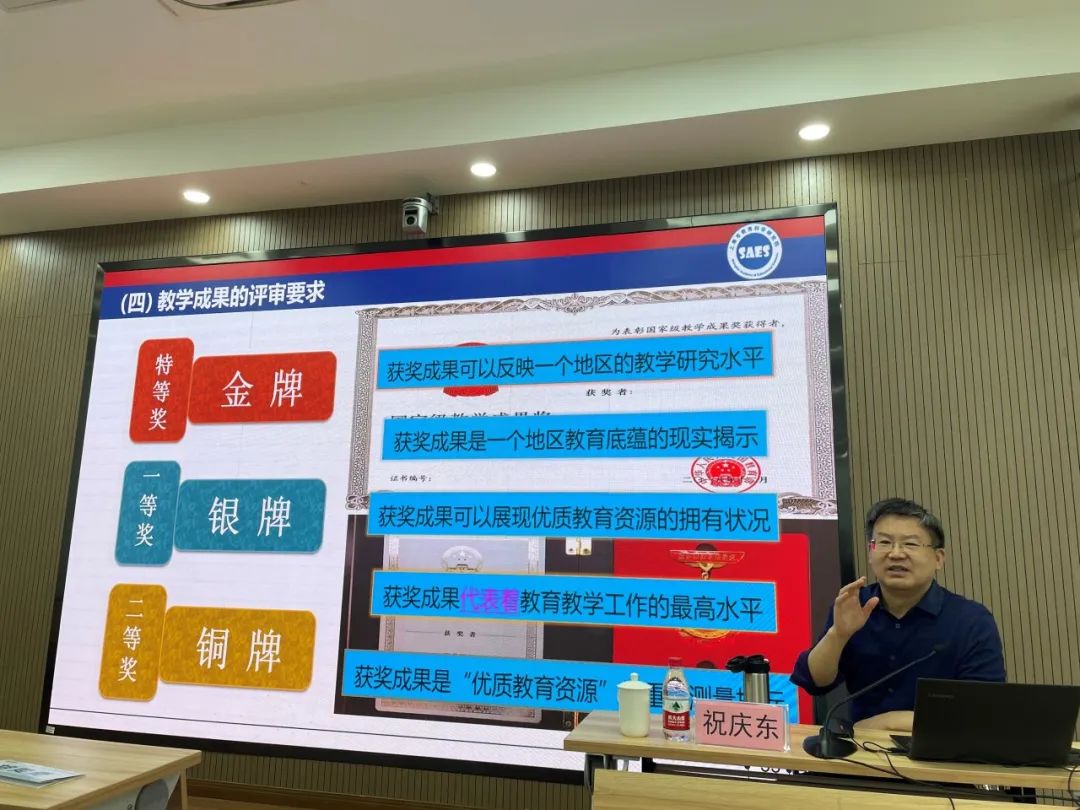 上海市教育科学研究院普教所培训中心主任祝庆东作了题为《幼儿园如何培育、撰写与申报教学成果——以获奖的国家教学成果为例》的报告。他结合近几年荣获国家级教学成果特等奖、一等奖的具体实例,从政策依据、国家级教育成果的申报范围、申报条件、教学成果的评审要求四个方面做了具体阐述,帮助学员厘清科研成果与教学成果的不同,明晰撰写教学成果报告的结构要素、撰写要求与表达方法。