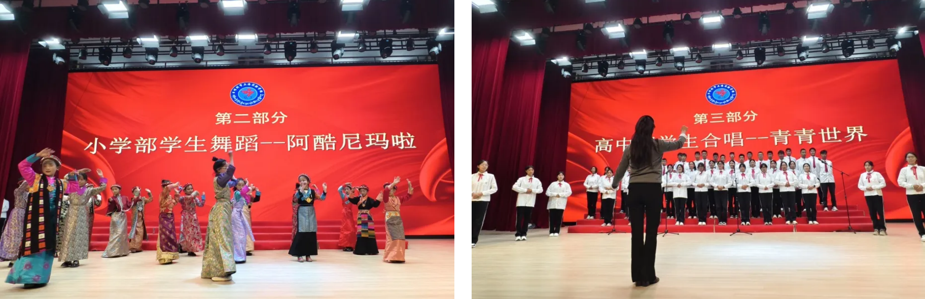 升旗仪式后,小学部与高中部分别带来舞蹈“阿酷尼玛啦”与合唱节目《青青世界》,展现了青春朝气。