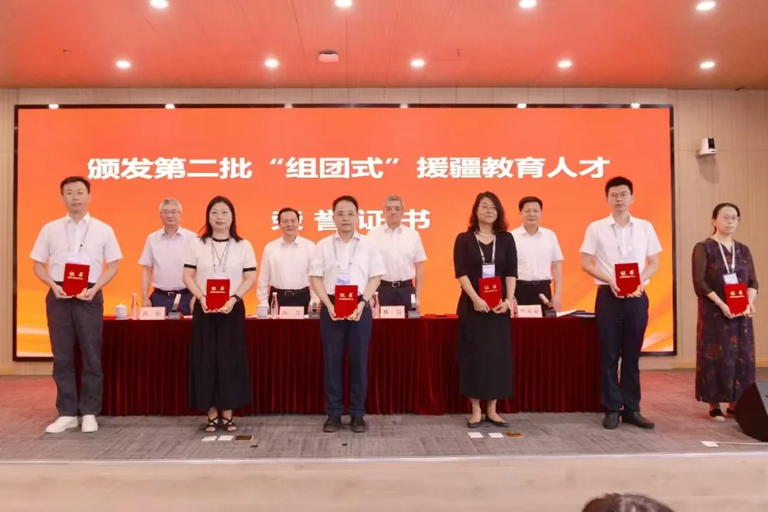 当天上午,上海市第二批“组团式”援疆教育人才工作总结会暨第三批“组团式”援疆教育人才行前动员会在联合国教科文组织教师教育中心世承讲堂顺利召开。市教卫工作党委、市教委、市政府合作交流办领导为为第二批“组团式”援疆教育人才代表颁发荣誉证书,为第三批“组团式”援疆教育人才代表佩戴大红花并授旗。