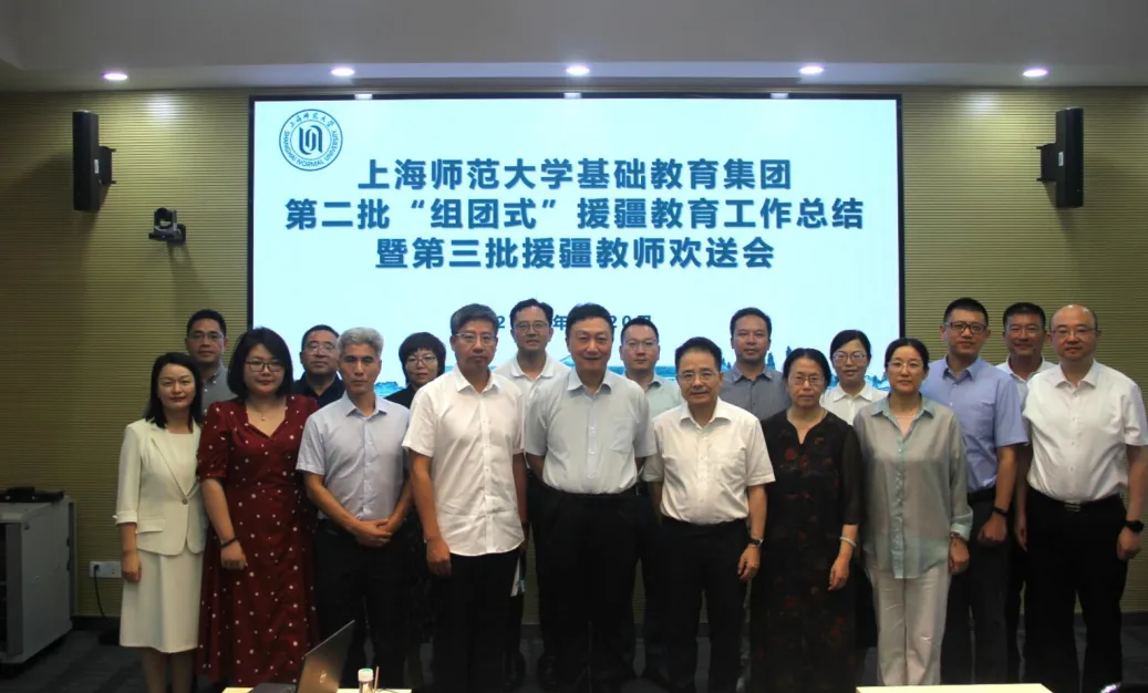 2024年8月20日下午, 基础教育集团第二批“组团式”援疆教育工作总结暨第三批援疆教师欢送会在上海师大会议中心3/4号会议室举行。校党委书记林在勇,党委副书记杨海燕,副校长张峥嵘,党委组织部部长、校办主任史佳华,教务处、 处长王健,人文学院党委书记潘黎勇,建筑工程学院党委副书记、院长胡振, 附属中学校长黄岳辉, 副处长、 附属嘉定高级中学校长郭长江, 第二附属中学校长蔡文, 第四附属中学校长朱银辉以及第二批、第三批援疆教师参会。会议由杨海燕主持。