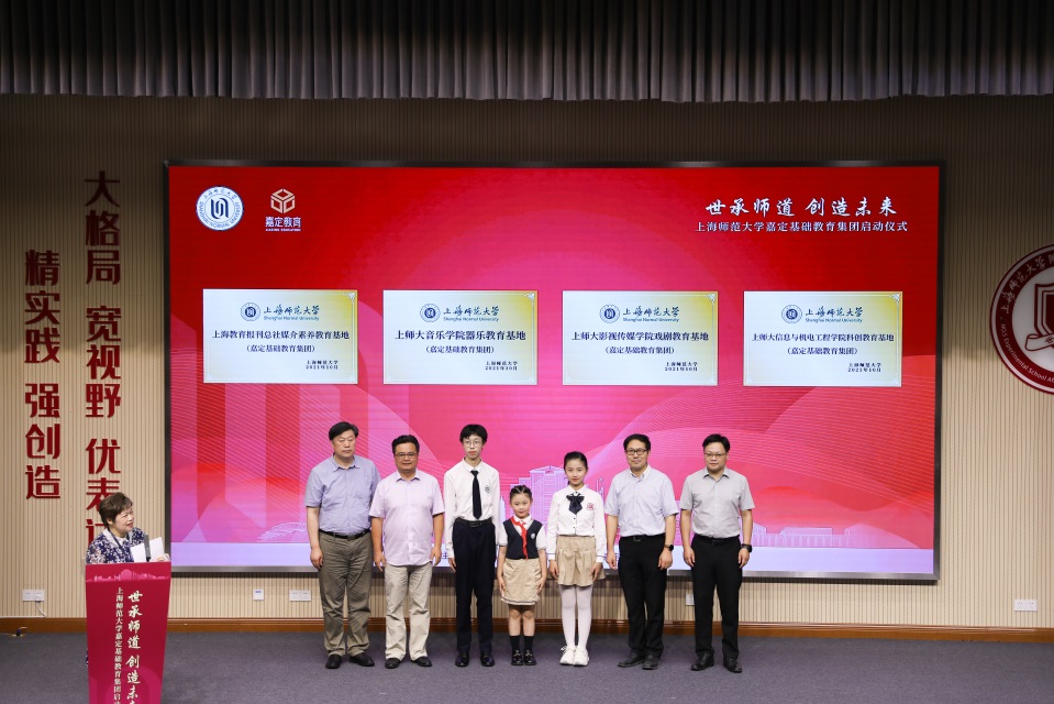 启动仪式由集团牵头校上师大附属嘉定小学校长吴宝英主持。在上师附五学生精彩的表演和校长陈勇致词后,上海教育报刊总社社长仲立新、音乐学院院长施忠、影视传媒学院院长赵炳翔、信息与机电工程学院院长张波携手三所集团成员校学生代表,一起为集团的器乐、戏剧、科创、媒介素养四个教育基地揭牌。