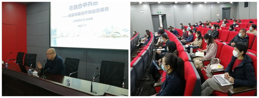 副校长张峥嵘为全体学员作《在融合中共进》的开班动员报告。张副校长对本期“领雁计划”研修班开班的背景、意义、学员组成、目标任务进行了详细地介绍。他指出,研修班要以 基础教育进一步发展为目标,同时要为助推五大新城基础教育发展发挥贡献好 的力量。他希望学员们能借助 基础教育发展研究院这一整合了上师大所有基础教育力量的平台,通过研修班的学习与相互交流,推动各自在工作岗位上的发展和上师大基础教育的未来发展。在开班动员上,张峥嵘强调“初心”“使命”“机遇”“融合”“成长”“平台”六个关键词,回忆了 作为“新中国为人民办教育的初心之地”的发展历程,强调回归“一流城市一流基础教育的师资摇篮”的学校使命,要求学员抓住教育现代化先行成为国家战略、五个新城建设带来的教育配套需求等机遇,向实践、向一线教育家学习,用理论武装、提炼教育主张,通过相互学习、融合,取长补短,互促互鉴、同频共振、同向而行,借助好上师大各类高水平平台,热切期盼学员们在研修过程中有所收获,最终看到成长并取得佳绩。