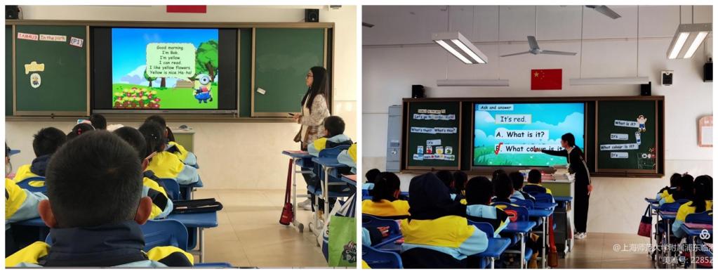 另外她指出小学英语课堂也不需要使用中文,可以通过创设情景,使用丰富形象的肢体语言和直观的教具如单词卡、图片、实物等来辅助学生理解语意。沈嘉祺老师也指出了可以通过班级里一起为自己取英文名,一起制定英语课堂规则,一起玩有趣的小游戏,营造英文课堂氛围,激发学生内驱力、集中注意力。