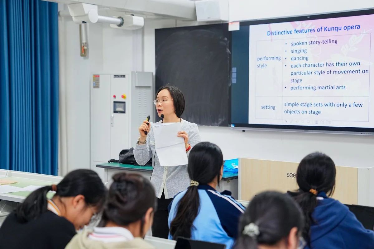 上海市宜川中学孙琪老师带来阅读课,将昆曲经典桥段与英文学习结合,在提高英语素养的同时,激发了学生对传统文化的热爱,帮助学生提高对我国传统文化的自信。交流过程中,两地老师们积极探讨培优补差等具体问题,收获颇多。