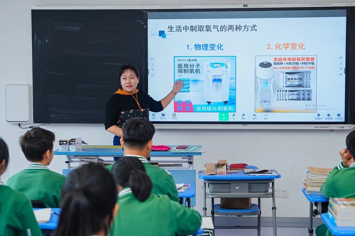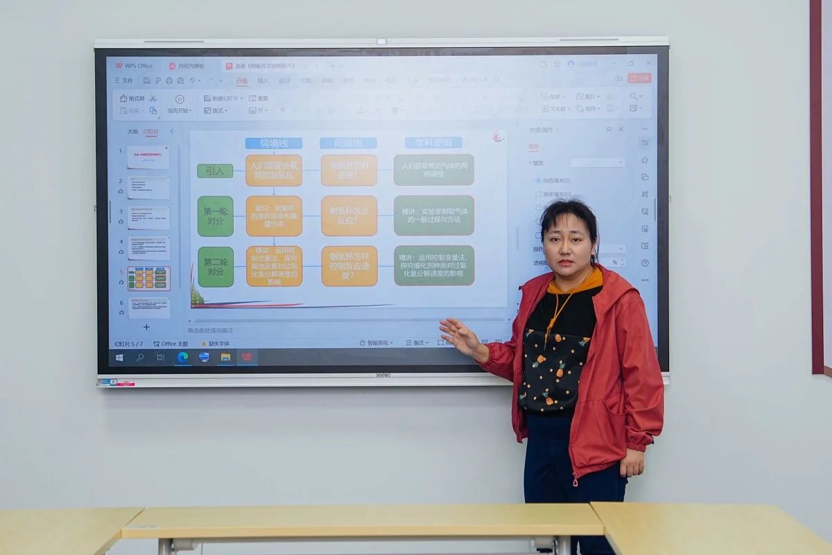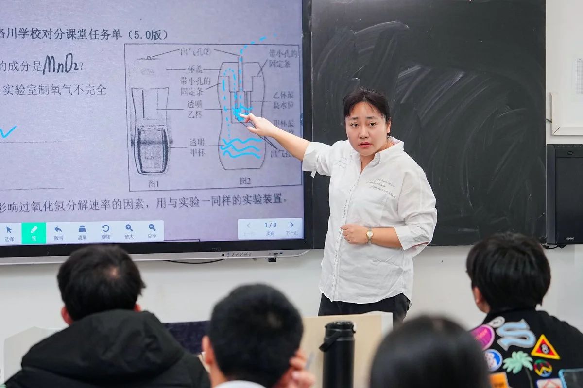 上海市洛川学校杜汇敏老师采用对分课堂教学模式进行授课,以制氧杯为情景贯穿整堂课,对常见气体制备进行复习。杜老师在学生内化和小组讨论的过程中,走下讲台,利用计分板记录学生的答题情况,并对学生的学习情况进行研判,了解学生学情,将课堂上的知识应用到实际当中,激发学生的积极性。