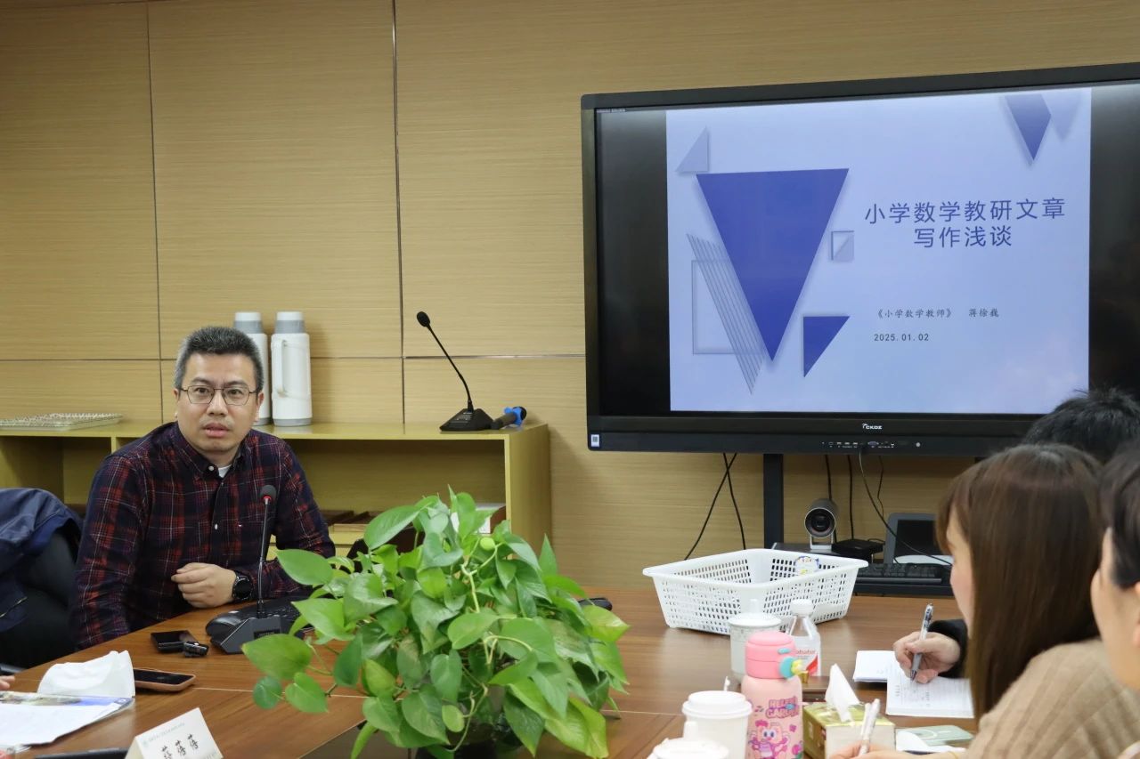 蒋徐巍做了题为“小学数学教研文章写作浅谈”的专题讲座,从选题方向建议、投稿注意点、写作案例解析三方面进行解说,特别强调教师应关注聚焦课题,了解不同期刊的特点与要求,清晰明了地表达教学思想和实践过程,写出一篇结构清楚、格式规范且有深度的文章。