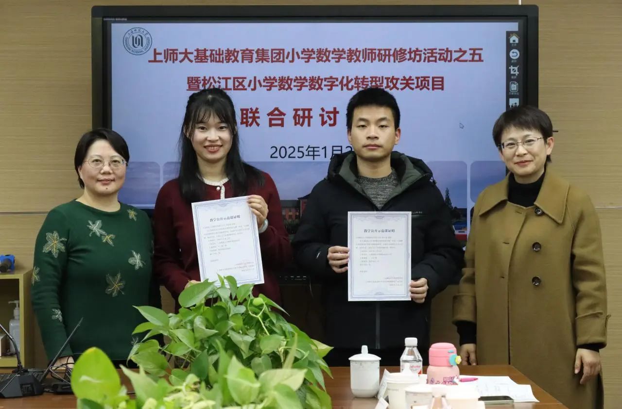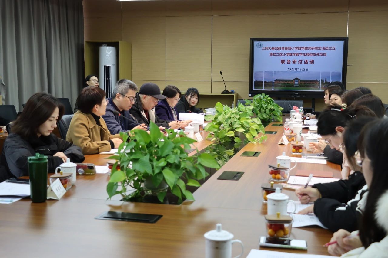 2025年1月2日,上海师大基教集团小学数学教师研修工作坊第五次活动暨松江区小学数学数字化转型攻关项目联合教研活动在 附属外国语小学举行。特邀嘉宾上海市宝山区教育学院、正高级教师、上海市特级教师潘小明,上海教育出版社总编助理、副编审、《小学数学教师》杂志执行主编蒋徐巍, 附属外国语小学党总支书记黄春霞,上师大基教集团小学数学教师研修工作坊全体学员,松江区小学数学数字化转型攻关项目团队,上海师大附属外国语小学数学组教师及上海师大研究生等40余人参加活动。活动由工作坊主持人、上海师大上海退役军人学院副院长刘兰英研究员主持。