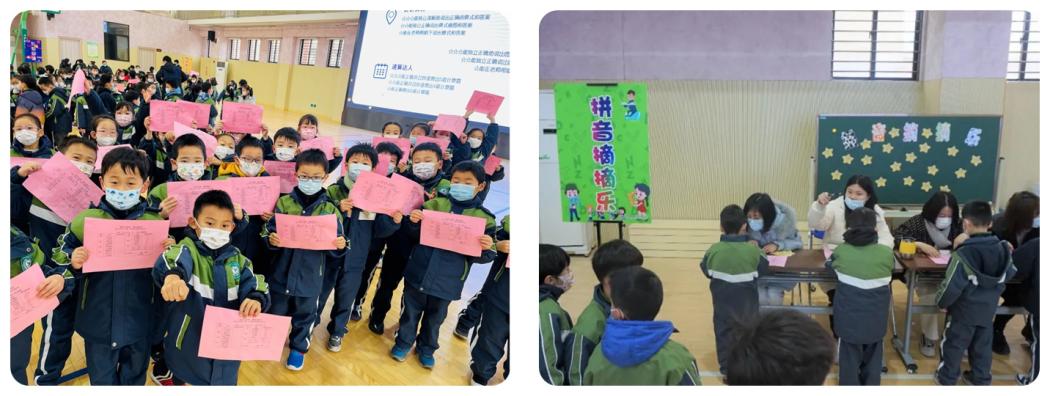 活动中,孩子们兴高采烈地穿梭于各个活动场地,或声情并茂地背诵课文,或聚精会神地认读词语,或津津有味地抽取图形,或饶有兴致地兑换奖品……整个闯关场地一派兴趣盎然的景象。