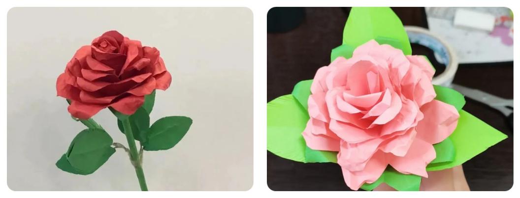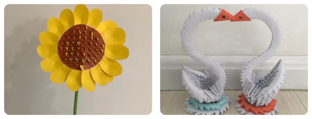 而在蔡乔莉老师和付敏老师的劳技线上课堂中,同学们手中一张张平淡无奇的纸竟千变万化出一朵朵千姿百态的玫瑰花、向日葵,还有那一个个造型丰富的小天鹅。小小彩纸在同学们的手中,折一折、叠一叠,尽显同学们的心灵手巧,更显露了非凡的观察能力、立体建构能力!