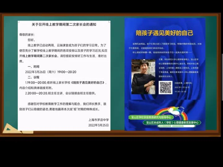 在最近一期家长学校中,家长们收看了王震老师主讲的《陪孩子遇见美好的自己》。班主任介绍近期教育教学安排和班级管理举措,反馈近期课堂互动及作业情况,表扬线上学习优秀行规,展示学生优秀作业。针对学生的共性问题,班主任给予家长亲子沟通的内容、技巧和策略,注意方式方法,讲求艺术性。