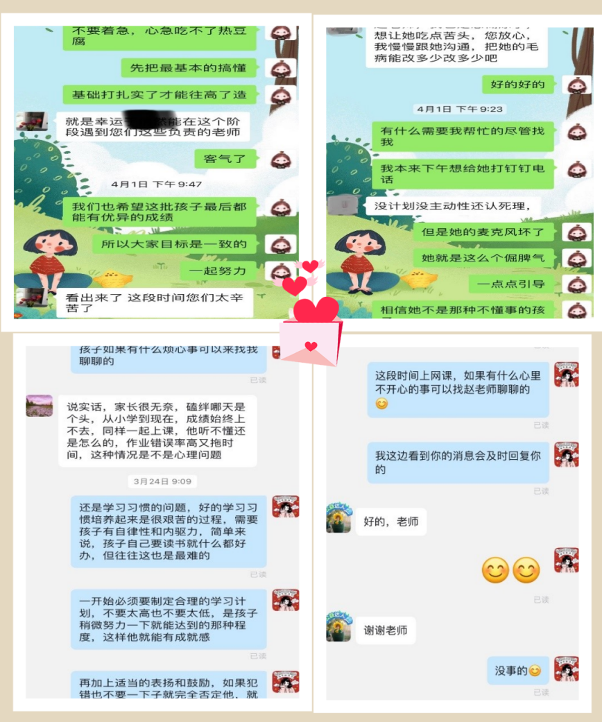 执教七年级的赵姝蔚老师同样也对学生们的心理健康很是关注。在上课之余,她经常找个别同学谈心聊天,掌握学生的状况。对于近阶段表现反常的学生,他也会及时联系,问清现状及问题,并实施提供指导与帮助。线上教学开展的第二周,班上同学小Y表现有些出人意料。在校时,她是一个做事效率很高的孩子。然而近期,作业情况却不理想。经过了解,原因是因为过度使用手机,且亲子关系较为紧张。知晓前因后果以后,赵老师先是和学生电话沟通,劝告她理解母亲,努力学习,扬长避短;而后,她也与孩子母亲展开沟通,给予教育孩子的方法指导。在赵老师的推动下,小Y同学和妈妈的关系缓和不少,学习也逐渐回到正轨。导师工作繁重,而对于这份“老娘舅”的工作,赵老师乐在其中,也愿意成为学生与家长们坚强的后盾。