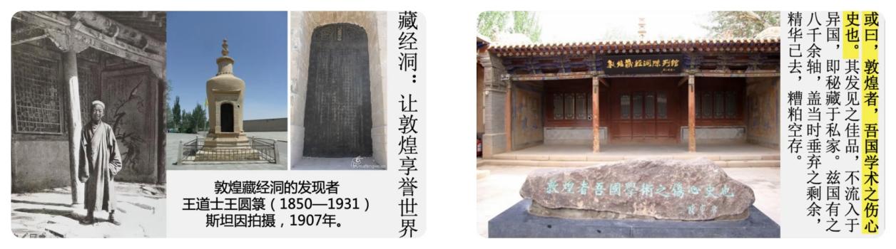英国斯坦因用极其不光彩的欺骗手段骗取24箱经卷等文物,法国伯希和把敦煌藏经洞中所有的遗书通检一遍并盗运其中的精华到欧洲,美国华尔纳盗剥了大面积壁画并掠走彩塑,日本带着千余件,俄国带着近万件残片……动荡的时局,和对古文物保护的淡漠,致使藏经洞中的大批敦煌遗书和文物先后被外国“探险队”捆载而去。国人不禁发出“敦煌者,吾国学术之伤心史也”之悲叹。