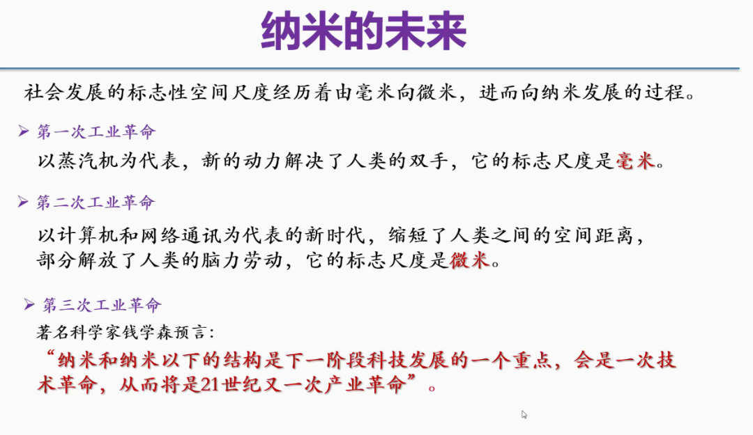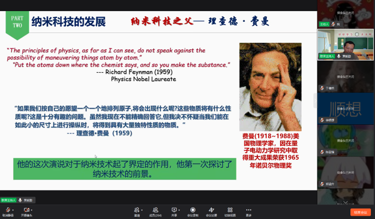在第二部分中,贾能勤教授对“纳米科技”这一名词术语进行了专业的讲解。“纳米科技”是指专门研究1-100纳米之间原子、分子物质层次结构、组成和特殊性能的科技,其最高境界是直接操纵原子、分子来构建具有特定功能的纳米材料、器件。为了使学生们更深入地感知人类对于“纳米科技”的探索过程,贾教授依次从“探索纳米世界的开端”、“科学仪器和观察技术的进步”、“我国纳米科技的发展”三个角度进行深度阐释,并明确:“纳米科技”的发展是一个由幻想到现实,逐步推进的过程。