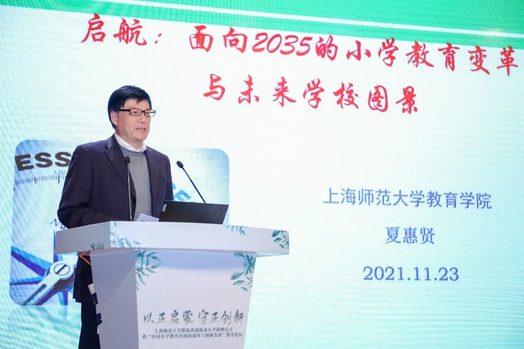 教育学院院长、博士生导师夏惠贤教授发言的主题是《启航:面向2035的小学教育变革与未来学校图景》。夏院长指出,小学不小,小学教育大于天,梅溪小学首创多个第一,是中国新教育的领头羊。夏院长介绍了 服务上海基础教育发展,和基础教育同向同行,同频共振的举措和贡献,组建学校发展共同体的大图景,梅溪小学与 小学教育专业将以“历史的第一”和“纽扣的第一”同频共振,交相辉映。
