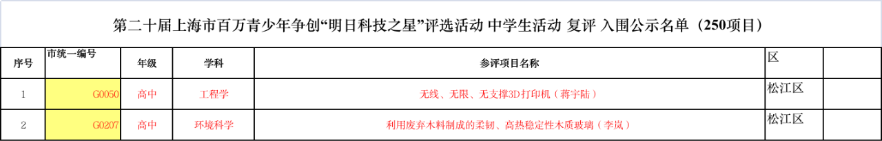 而在第二十届上海市百万青少年争创“明日科技之星”评选活动中学生活动复评中,外语附中又入围2例,分别为高一(10)蒋宇陆同学的“无线、无限、无支撑3D打印机”和高一(3)班李岚同学的“利用废弃木料制成的柔韧、高热稳定性木质玻璃”。