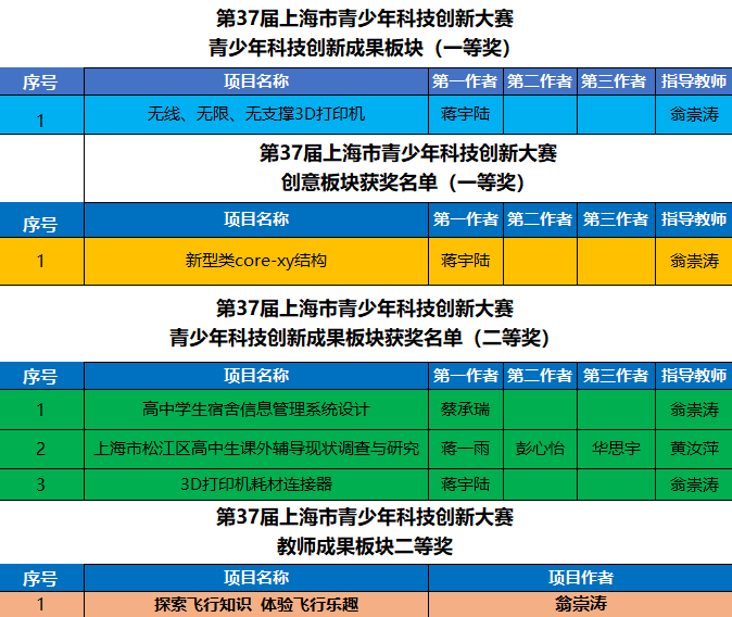在第十七届宋庆龄少年儿童发明奖,学校蒋宇陆同学的作品“无线、无限、无支撑3D打印机发明”喜获市一等奖,入围国赛。学校的学生在老师指导下还获得了两项国家级实用新型专利证书。此外在松江区第十届学生研究性学习成果评比活动,学校师生取得了一等奖1项、二等奖4项、三等奖6项。