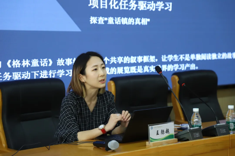 在随后的理论讲解中,王际超老师从“世界观与项目化设计:构建沉浸式的阅读体验”、“保护入戏与框架距离”、“教师入戏与戏剧化讲故事”、“中心与连接角度”四个方面进行戏剧教学法解读。她指出,通过“童话镇”这个虚构的世界,将分散的《格林童话》故事统整为一个共享的叙事框架,让学生不是单独阅读独立的故事,而是在探查“童话镇的真相”这一整体任务驱动下进行学习,最终形成的展览即是真实世界的学习产出。教师是剧情的推动者,通过角色扮演引导故事发展,同时也是规则的制定者,平衡戏剧活动与教学目标。