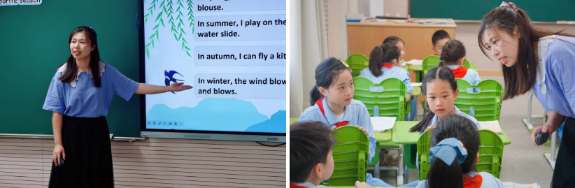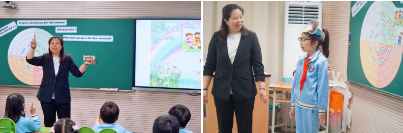 附属黄浦梅溪小学黄燕老师与附属闵行日新实验学校赵依斐老师同课异构《Seasons》,围绕四季主题展开学习。黄老师本节课以“四季”为主题,采用项目式学习框架,以核心问题“如何介绍四季”统领单元,分解子问题链。通过天气、活动等多维度探究,引导学生运用情态动词can及核心词汇描述季节特征,整合零散知识为结构化表达,培养学生语言应用能力,最终通过设计“奇妙四季圈”实现个性化输出,激发学生观察自然、感受四季之美,表达对大自然的喜爱之情。