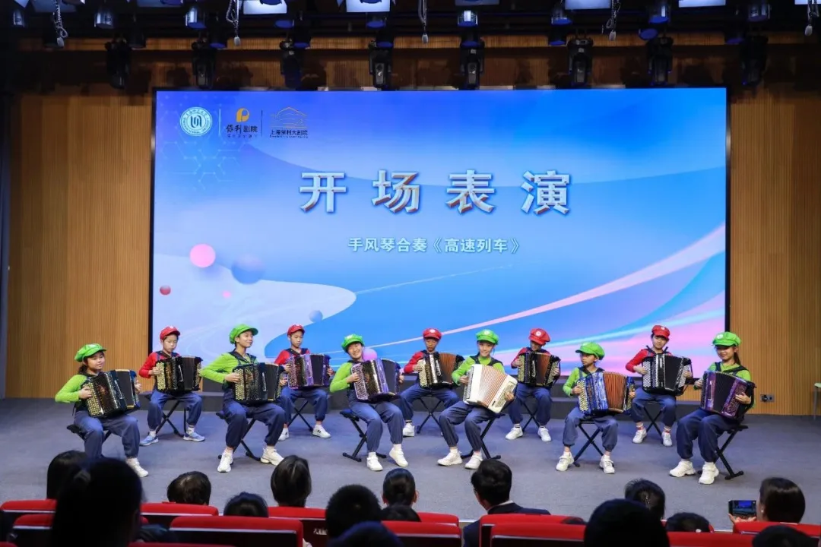 伴随着暖场节目的动感节奏,附属嘉定小学五年级学生表演的手风琴合奏《高速列车》瞬间让剧场的氛围变得轻盈而欢快,活动在学校美育宣传片《与乐相伴 与美相随》中拉开序幕。整场活动由附属嘉定小学党政办主任徐琪主持。