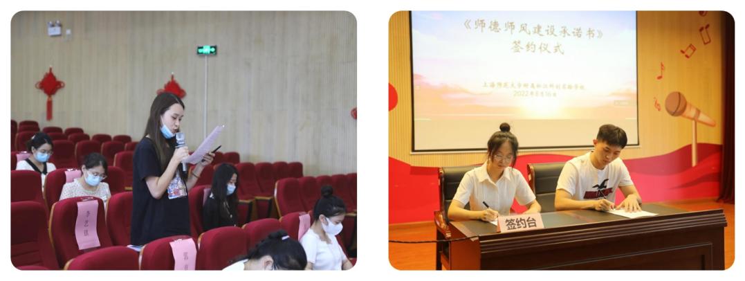 随后,教师代表诵读《新时代中小学教师职业行为》和《松江区教师“八个严禁”》。科创实验学校书记沈丽华校长为全体教师细致深入地解读了《 附属松江科创实验学校师德建设方案》,沈校长指出,身为人民教师,不仅要理解师德师风的含义,更要坚决做到不踩红线、不碰底线,严守师德规范。聆听时代召唤,践行师德之美,全体教师随即郑重地签署了《师德师风建设承诺书》。