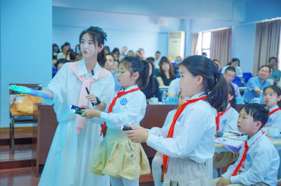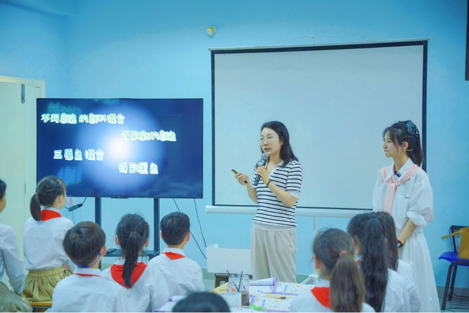 附属奉贤实验小学许静老师与 建筑工程学院姚传芹老师联手执教三年级《色彩实验室》项目化学习课例。课堂上,两位教师打破传统教学边界,引导学生通过色彩混合和色光混合实验等实践环节,将艺术审美与科学思维有效融合。学生们分组协作、动手操作,在跨学科情境中迸发创新火花。