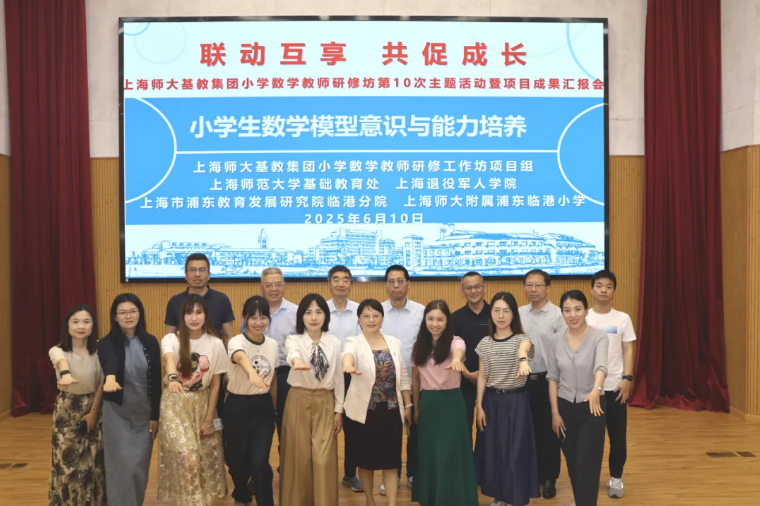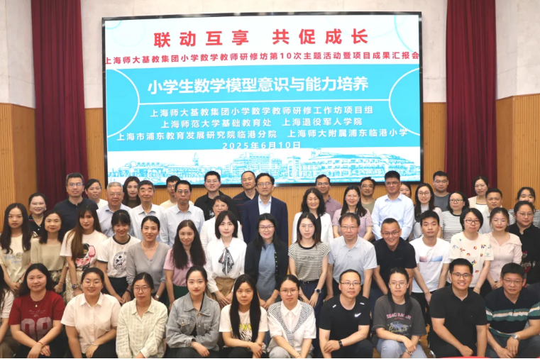 2025年6月10日下午,以“联动互享 共促成长”为主题的上海师大基教集团小学数学教师研修工作坊第十次主题活动暨项目成果总结汇报会在 附属浦东临港小学举行,本次活动的研修主题是“小学生模型意识与能力培养”。 处长郭长江, 基础教育发展研究院办公室主任周燕菊、研训员王巍,华东师范大学教育学部教授、博士生导师孔企平,上海市教委教研室原小学数学教研员、上海市特级教师姚剑强,上海市宝山区教育学院正高级教师、上海市特级教师潘小明,上海教育出版社副编审、《小学数学教师》杂志执行主编蒋徐巍, 附属浦东临港中学党支部书记、校长、上海市特级教师赵玉梅,上海市浦明师范学校附属小学党总支书记、临港新片区小学数学兼职研究员沈金娟,上海师大基教集团小学数学教师研修工作坊全体学员,上海市浦东新区赵玉梅数学名师基地学员,上海市临港新片区小学数学攻关团队,临港新片区二、四年级数学教师, 附属浦东临港小学、 附属浦东临港科创小学、 附属秋萍学校的数学教师团队,以及 教育学院、退役军人学院研究生等70余人参加活动。活动由工作坊主持人、 上海退役军人学院副院长刘兰英研究员主持。