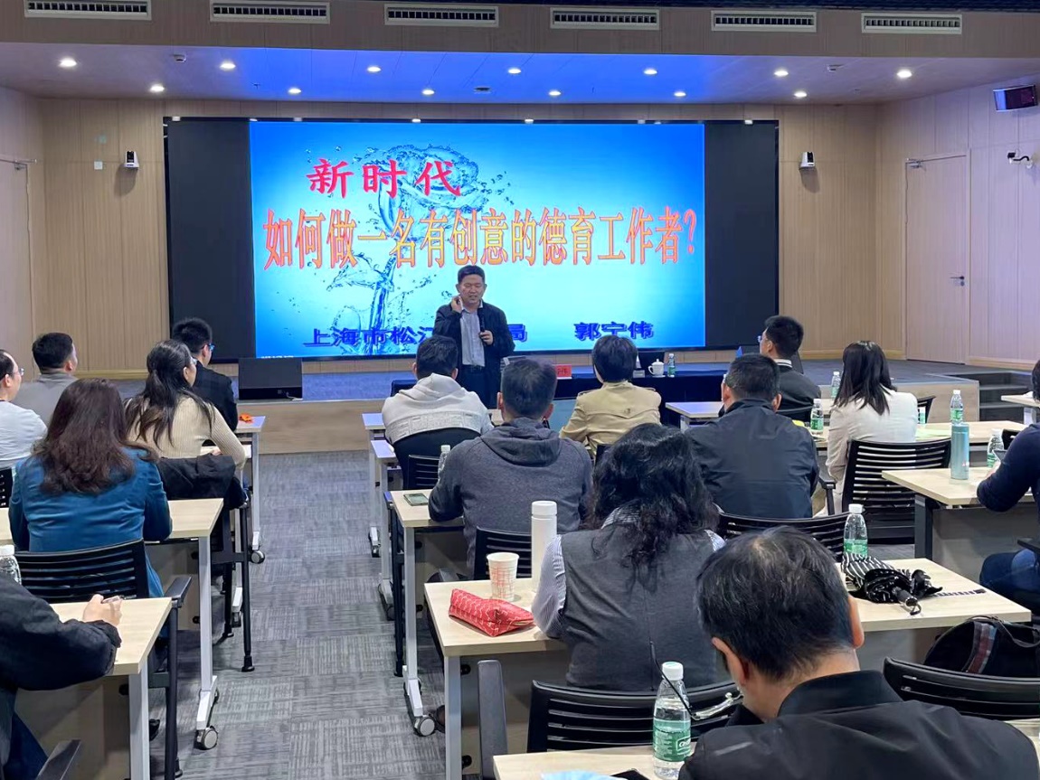 下午的培训,由松江教育局副局长郭宁伟进行了题为“新时代,如何做一名有创意的德育工作者?”的讲座。郭局长以自己多年在松江一中的实际工作为例,认为进行德育工作应当以“一要注重教育的本源价值、二要注重学生的真实需求、三要注重学生的主体性发展、四要注重资源的科学利用、五要注重教育场的恰当营造、六要注重活动的后期延续”等六个方面为原则,在德育主题方面进行理念创新、主题创新、主体创新、形式创新、资源创新、时空创新,用敏锐的洞察力,以及教育工作者的胸怀和智慧将文化资源巧妙地整合利用,将德育工作落到实处,落到每个学生的心坎里。