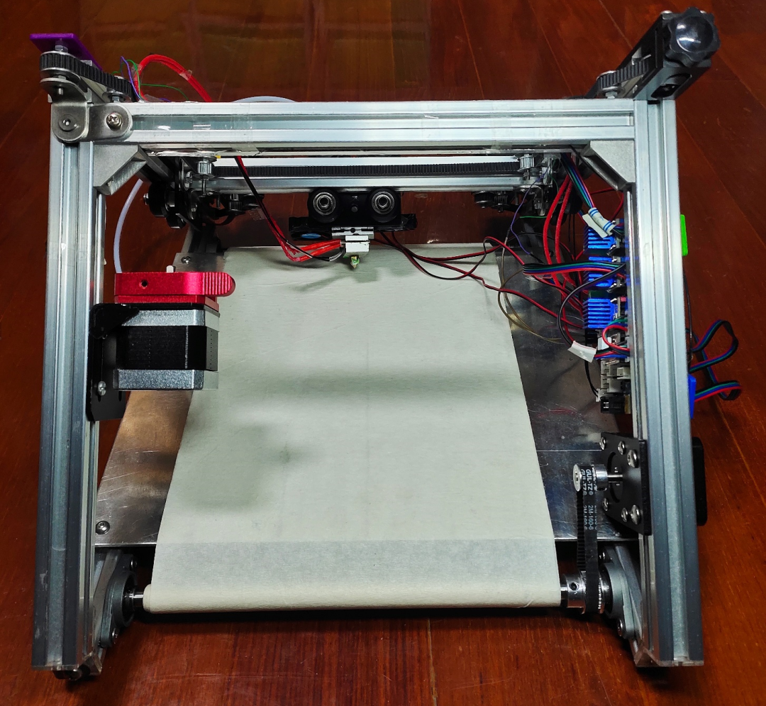 为了解决这些常见问题,蒋宇陆舍弃了之前两台3D打印机的基础框架,采用45度角打印模式、Core-XY运行架构和传送带Z轴制作了一款全新的3D打印机。“设计灵感源于勤于探索和热爱观察。”蒋宇陆坦言,之所以想到采用45度角来设计,是因为注意到国外有人将3D打印机底板呈45度角斜放,这样可以减少支撑。在此基础上,他又不断琢磨,配合传送带底座和带有WIFI功能的主板,并对倾斜打印角度进行了可随意调整的优化,最终制作出了无线、无限、无支撑的3D打印机。