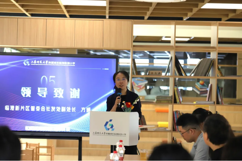 方娟在总结致辞中,首先对附属浦东临港科创小学在短时间内营造出的浓厚科创氛围表示赞赏,并对 一直以来的专业支持表示感谢。她指出,附属浦东临港科创小学是由浦东新区教育局、临港新片区管委会与 三方合作共建的重要成果,既依托上海师大的优质教育资源,又契合临港“科创之城”的发展定位,拥有独特的发展优势。方娟表示,临港新片区管委会将继续支持学校对接区域企业资源,推动学校深度融入临港科创城建设进程。
