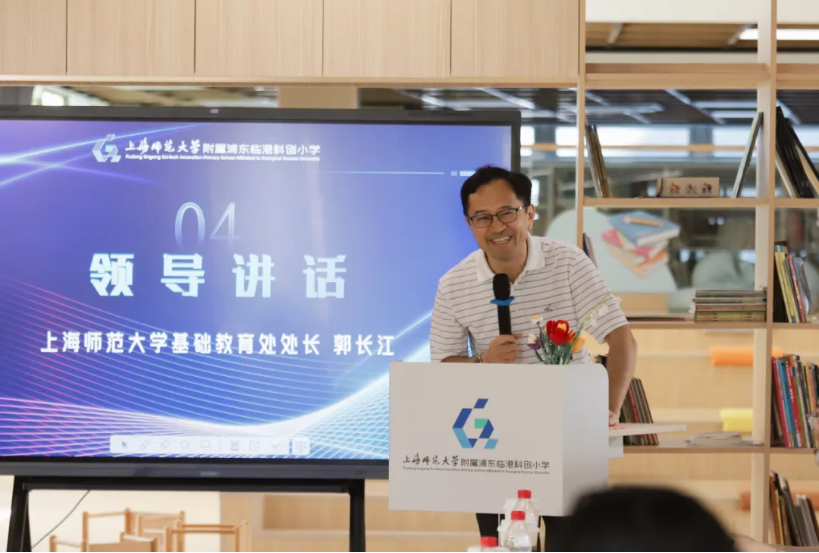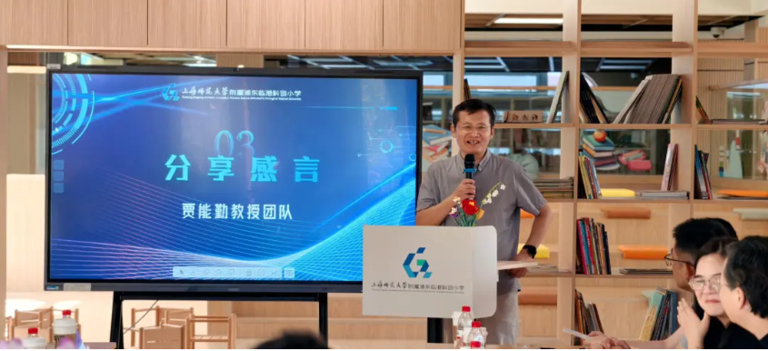 贾能勤代表团队发言,他表示,附属浦东临港科创小学“玩中学、学中玩”的校园文化,真正体现了“以生为本”的育人理念。此次合作是 教育资源共享的具体实践。未来,团队计划以“大手拉小手”的形式,推动大学生、研究生进校,共同绘制科技教育新画卷。同时,学校可以充分联动 的教授研究资源与临港新片区的高新技术产业资源,汇聚优质动能,注入校园日常,共同探索适合小学生的科创教育新模式,着力打造“未来之光”品牌,让科技的种子在孩子们心中生根发芽。