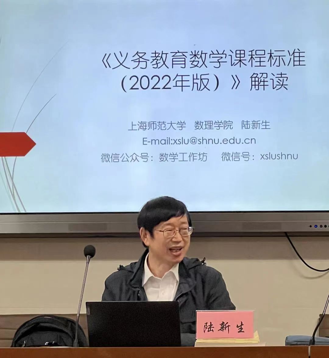 课堂展示与研讨结束后,进入此次活动第二环节。首先,由 数理学院陆新生副教授做了《义务教育2022版数学课程标准》解读。陆教授从课标修订的基本原则、核心素养的构成,课程目标的制定等方面做了深刻解读,为助力一线教师进行课堂改进带来了一定的启发。