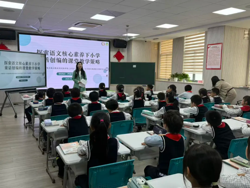 2025年10月23日, 基教集团童话教研共同体研修工作坊与平凉路第三小学教育集团联合教研活动在 附属杨浦滨江实验小学正式开启。本次活动以“探索语文核心素养下小学童话创编的课堂教学策略”为主题,旨在通过课堂展示与专家引领,深化对童话创编教学的理解与创新。杨浦区小学语文教研员张卓倩及语文中心组成员、 教育学院师生代表、 基教集团童话教研共同体校教师代表、平三小学教育集团教师共同参与,搭建起校际教研的优质平台。