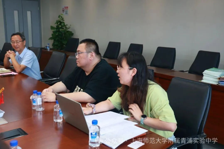 仪式后,附属青浦实验中学相关负责教师就人工智能课程与STEM课程的建设成果与规划进行了专题汇报,展示了附属青浦实验中学在科技创新课程体系上的探索与实践。潘建国教授在听取汇报后,从高校视角与产业前沿出发,对课程体系的纵深发展、项目设计的创新性提出了宝贵的指导意见,为附属青浦实验中学下一阶段的科技课程建设指明了方向。